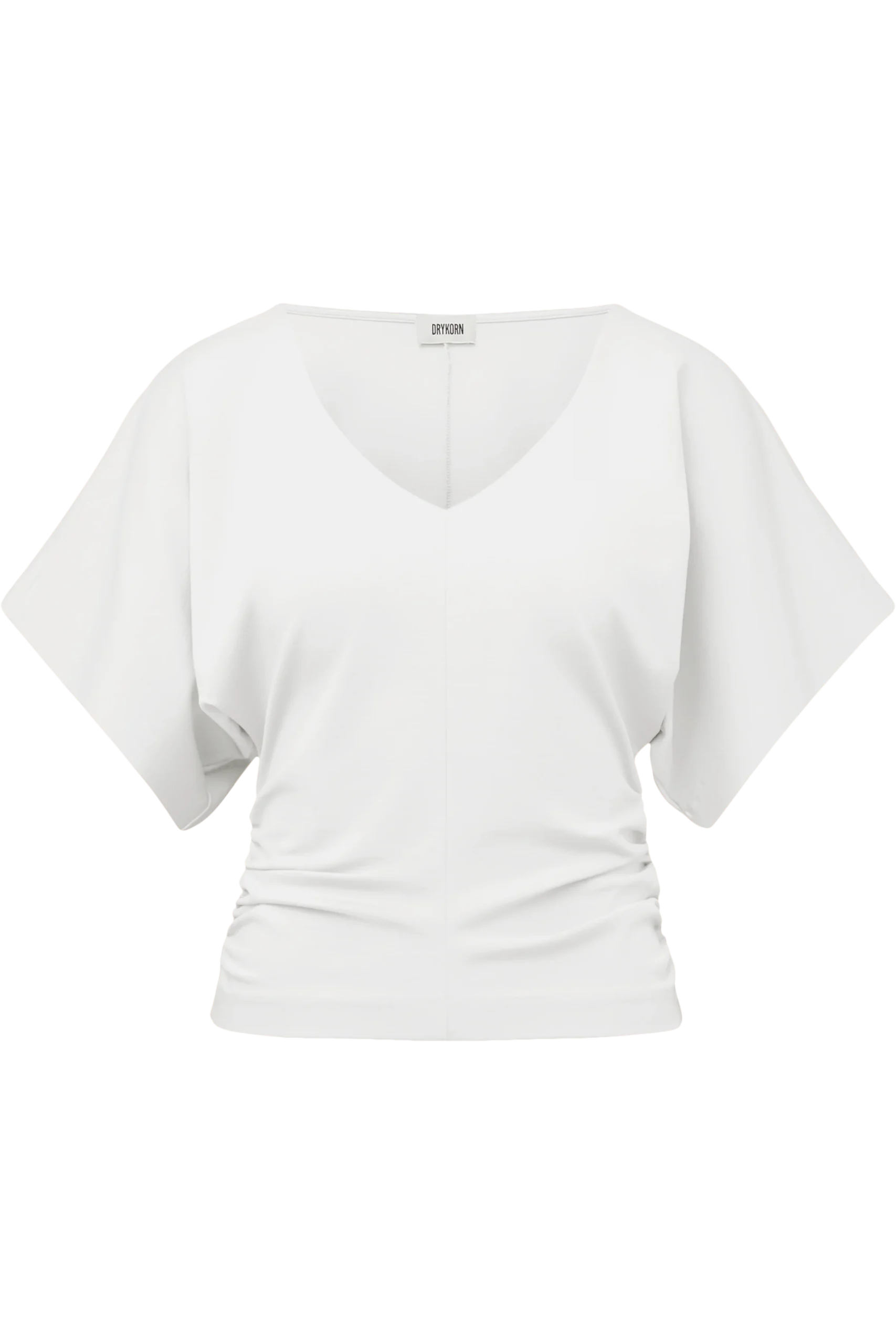 Beige Top van Drykorn met een halflange mouw en een v-hals. Dit model Pamara heeft een aangesloten pasvorm rondom de middel.