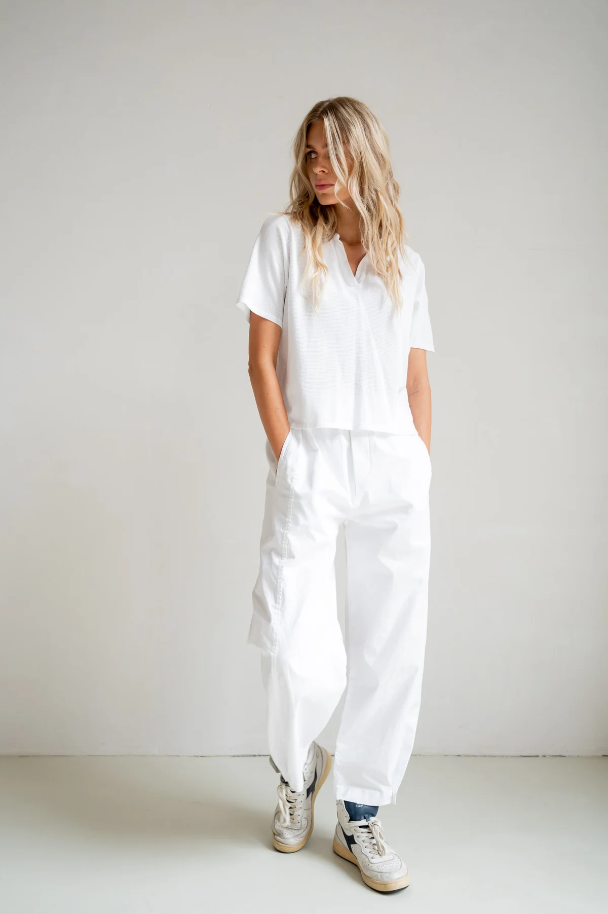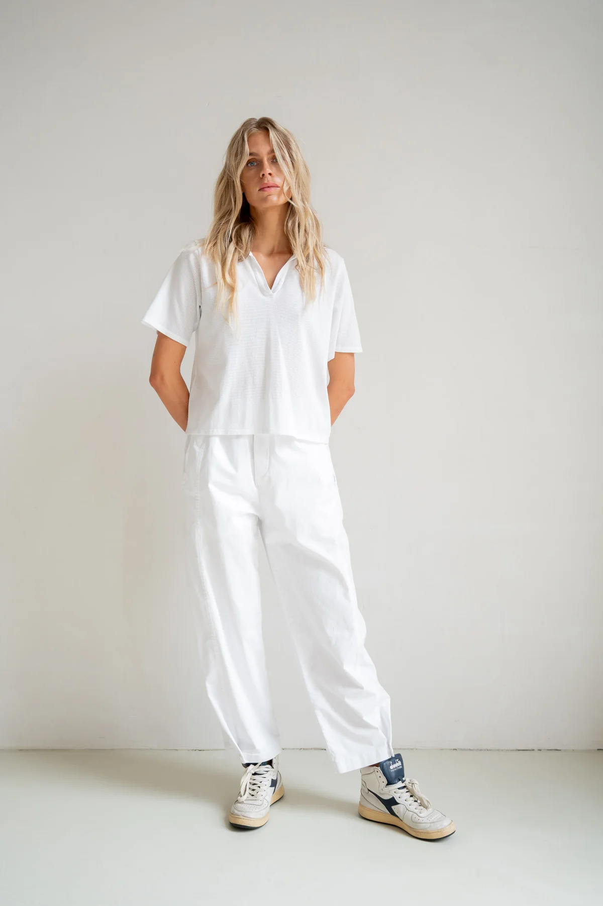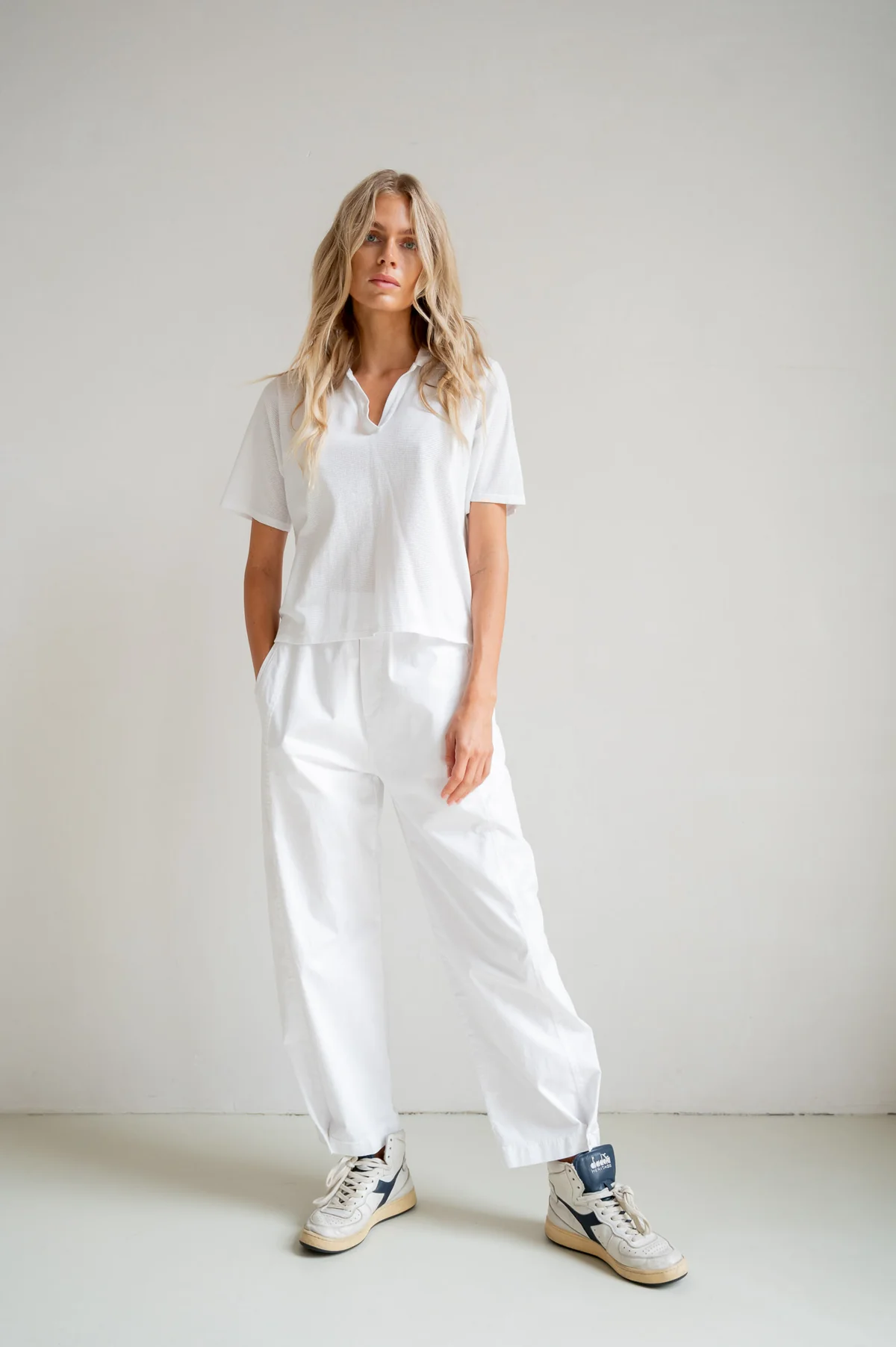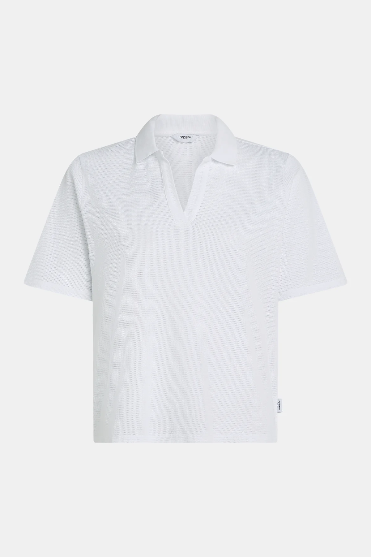 Een moderne interpretatie van een klassiek poloshirt. Deze lichtgewicht top heeft een relaxte pasvorm, een zachte, gestructureerde stof en een open kraag voor een moeiteloze, verfijnde look. Perfect voor warme dagen of om gemakkelijk te combineren met andere kledingstukken, en combineert comfort met ingetogen stijl.